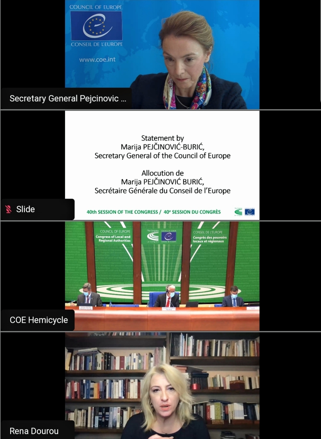 Συγκεκριμένα, η Ρένα Δούρου θύμισε ότι σύμφωνα με τα στοιχεία του ΟΗΕ, έχουν αυξηθεί και ενταθεί τα περιστατικά έμφυλης και ενδοοικογενειακής βίας παγκοσμίως την περίοδο της πανδημίας, και συνέδεσε το γεγονός αυτό με την σοβαρή αρνητική εξέλιξη που συνιστά η απόφαση της τουρκικής κυβέρνησης να αποσυρθεί η χώρα από τη Σύμβαση της Κωνσταντινούπολης για την καταπολέμηση της βίας κατά των γυναικών. Με δεδομένο ότι η μείωση των ανισοτήτων είναι μία από τις προτεραιότητες δράσης του Κογκρέσου στο πλαίσιο των αρχών του Συμβουλίου της Ευρώπης, η Ρένα Δούρου έθεσε στη Γενική Γραμματέα το θέμα της ανάγκης για μία “ισχυρή πρωτοβουλία στην κατεύθυνση της προώθησης της ισότητας των φύλων και της αντιμετώπισης της βίας κατά των γυναικών”. Απαντώντας η ΓΓ Marija Pejčinović Burić υπογράμμισε τη σημασία της επικύρωσης και εφαρμογής της Σύμβασης της Κωνσταντινούπολης από όσο το δυνατόν περισσότερες χώρες και τόνισε ότι το μήνυμα όλων των οργάνων του Συμβουλίου της Ευρώπης είναι η απόλυτη δέσμευσή μας στην προστασία των δικαιωμάτων των γυναικών με τον διπλασιασμό των προσπαθειών μας”. “Δυστυχώς έχουμε πολύ δρόμο μπροστά μας”, κατέληξε η ίδια.