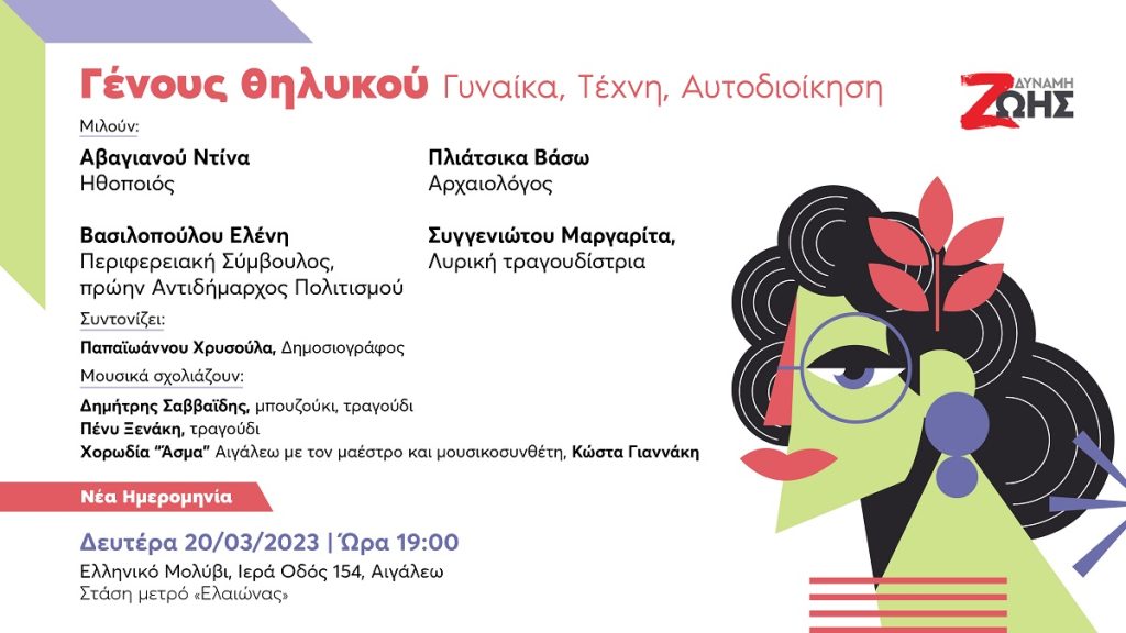 “Γένους Θηλυκού : Γυναίκα, Τέχνη, Αυτοδιοίκηση”. Η Δύναμη Ζωής οργανώνει εκδήλωση τη Δευτέρα, 13 Μαρτίου, στις...