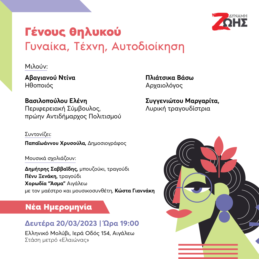 Τη Δευτέρα 20 Μαρτίου, στις 19.00, στο Ελληνικό Μολύβι (Ιερά Οδός 154, Αιγάλεω, Μετρό: Στάση “Ελαιώνας”) η Δύναμης Ζωής οργανώνει εκδήλωση με τίτλο: “Γένους Θηλυκού : Γυναίκα, Τέχνη, Αυτοδιοίκηση”.